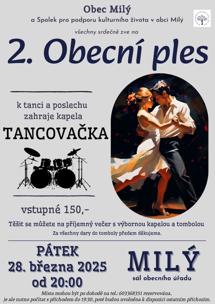 Všechny srdečně zveme na 2. Obecní ples na sále Obecního úřadu v pátek 28.3. 2025 od 20:00. K tanci a poslechu zahraje kapela Tancovačka.