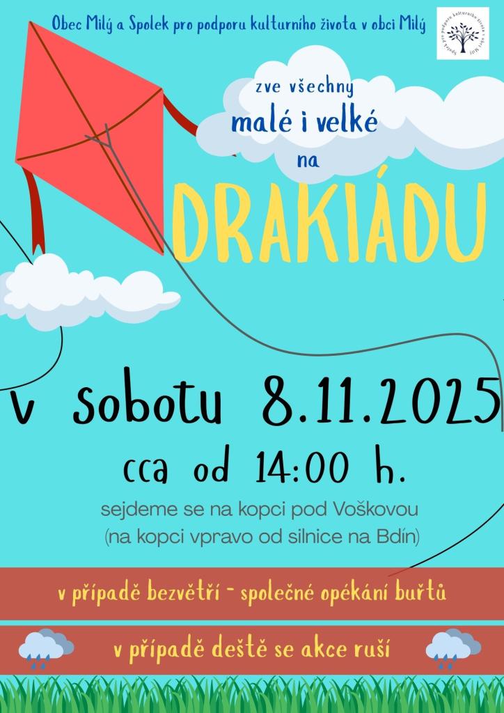 V sobotu 8.11. 2025 zveme všechny na společné pouštění draků. Kolem 14 h. se sejdeme na kopci pod Voškovou. V případě deště se akce ruší. Bližsí info na plakátu.