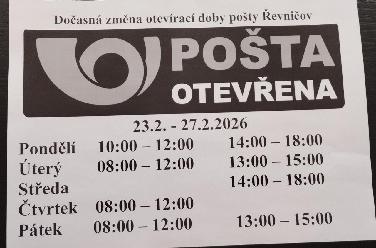 POŠTA ŘEVNIČOV - dočasná změna otevírací doby Upozorňujeme občany, že pošta v Řevničově má v týdnu 23.2.-27.2.2026 dočasnou změnu otevírací doby - viz obrázek